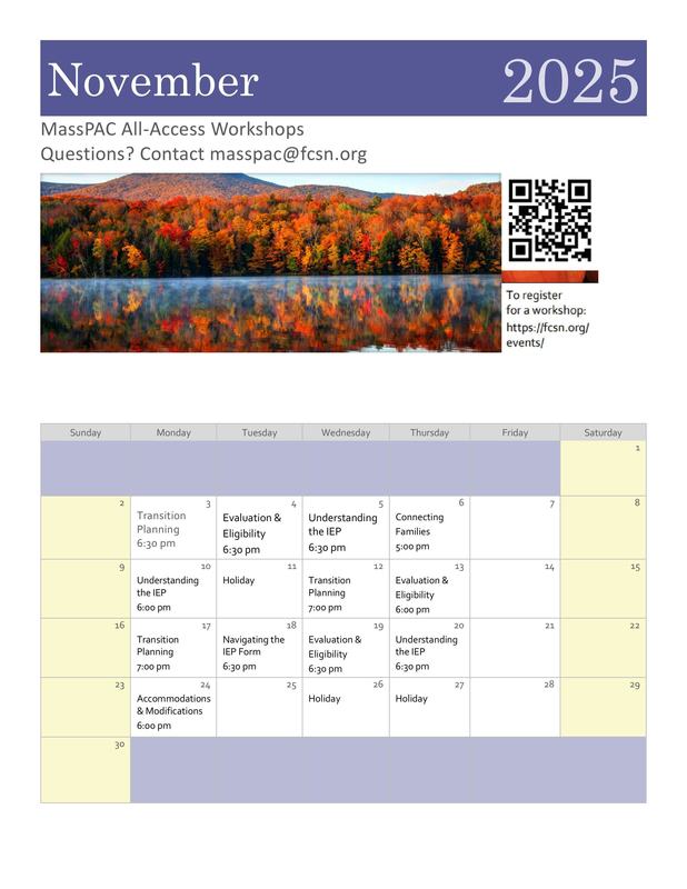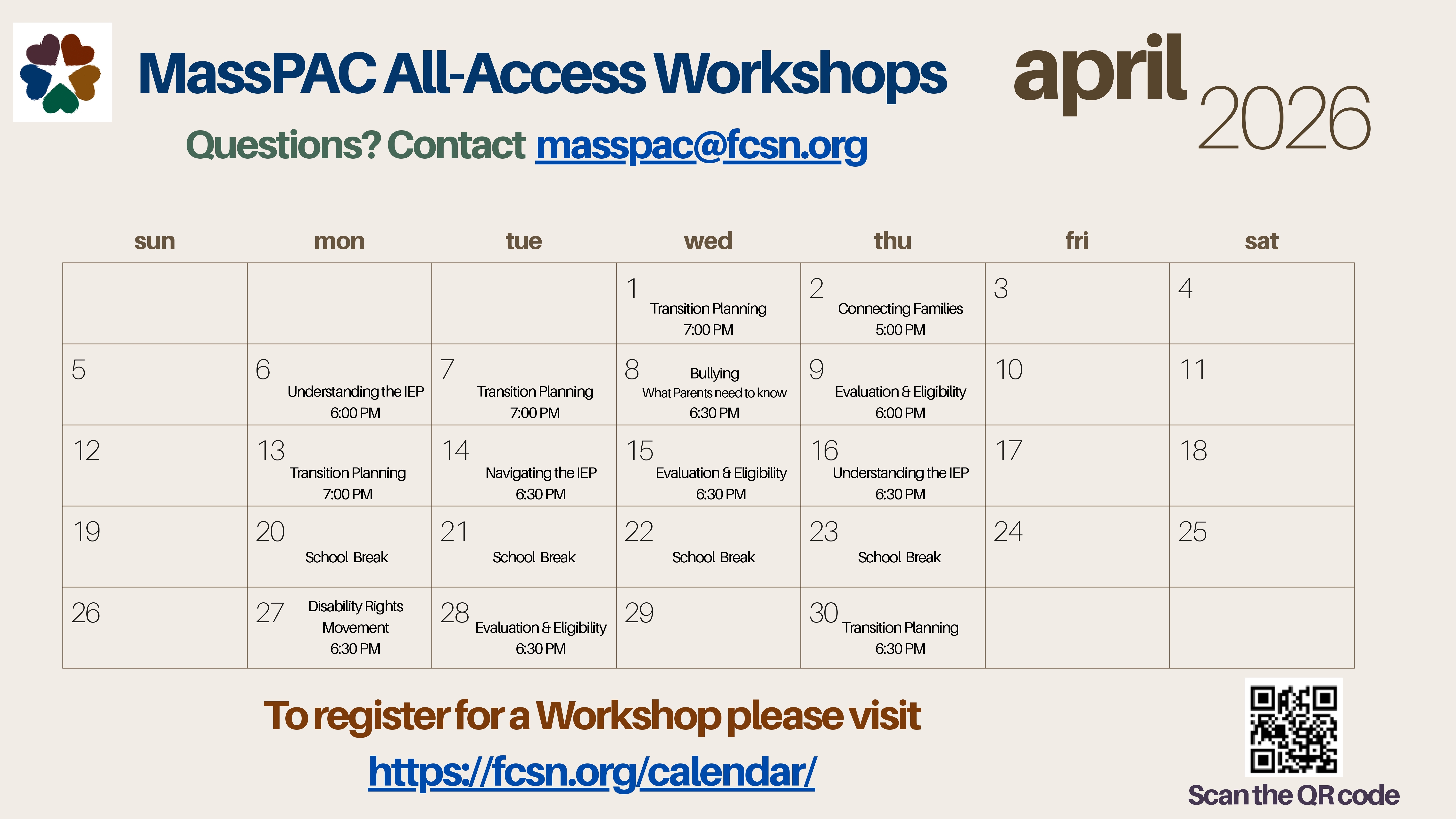 As MassPAC members, the Woburn SEPAC is able to offer the full slate of All-Access Workshops, in partnership with the Federation for Children with Special Needs.